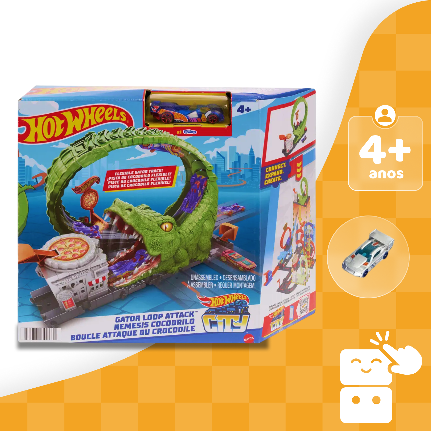 A cidade está em perigo e só você pode salvar o dia com a Hot Wheels Ataque do Crocodilo! Uma aventura cheia de ação onde seu carrinho precisa escapar das mandíbulas de um crocodilo gigante. Prepare-se para manobras radicais, emoção sem limites e muita adrenalina com esta pista espetacular da Mattel.