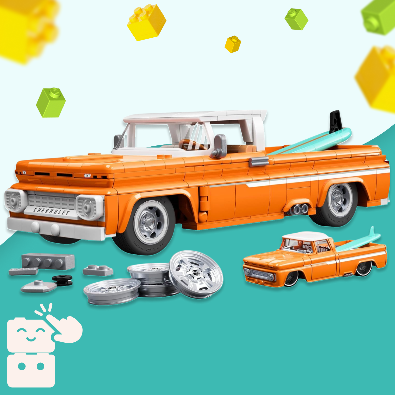 Este conjunto conta com 858 peças, cuidadosamente projetadas para que você construa uma réplica robusta, rica em detalhes e cheia de identidade do lendário Chevy Pickup 1962.