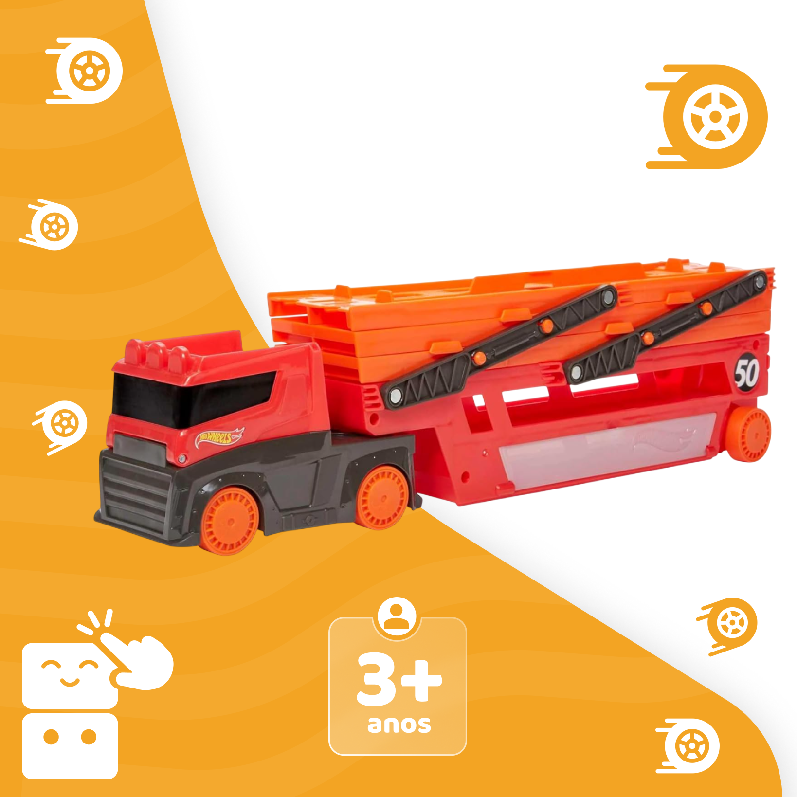 Com espaço para até 50 carrinhos, o trailer é perfeito para guardar, exibir e transportar sua coleção Hot Wheels com estilo e praticidade.