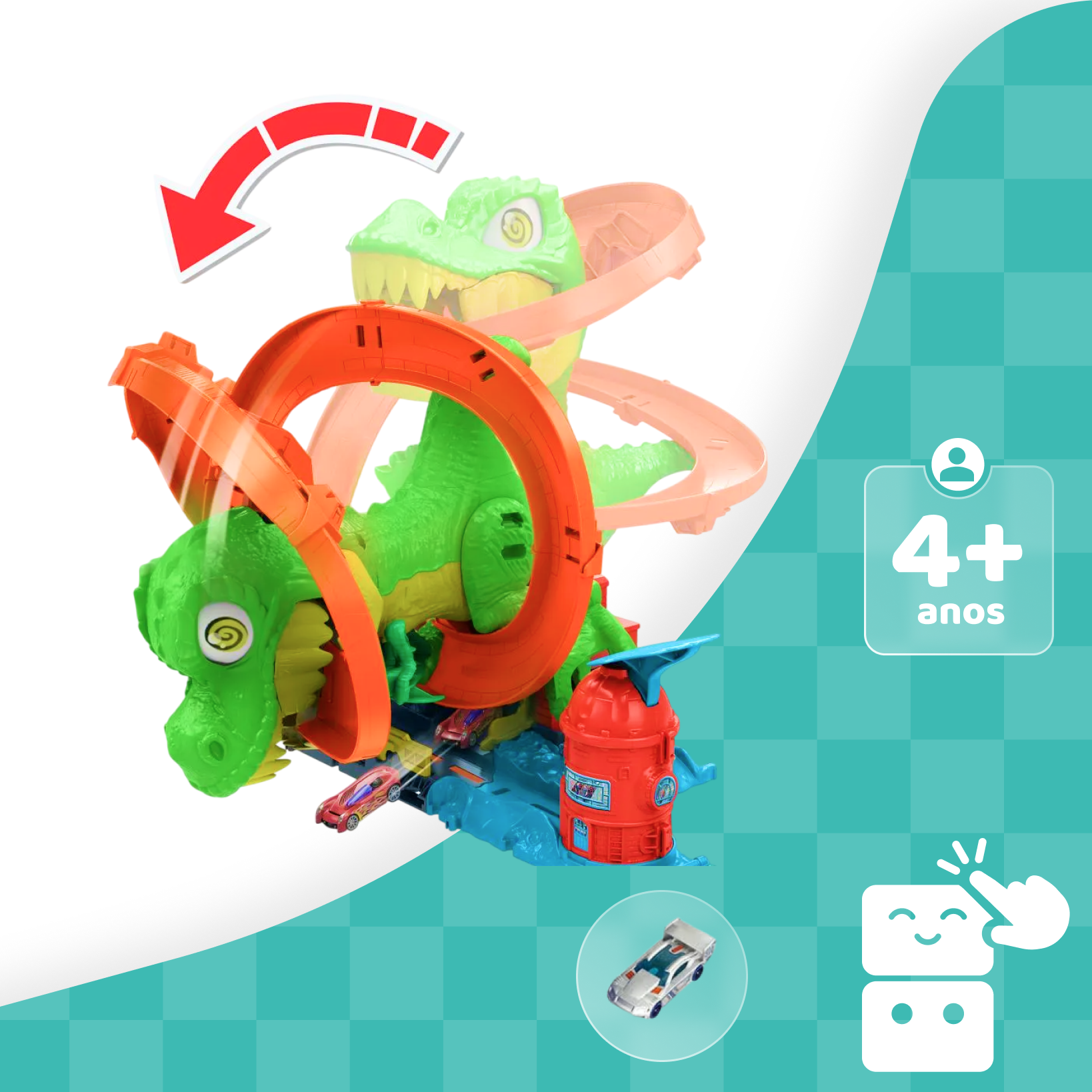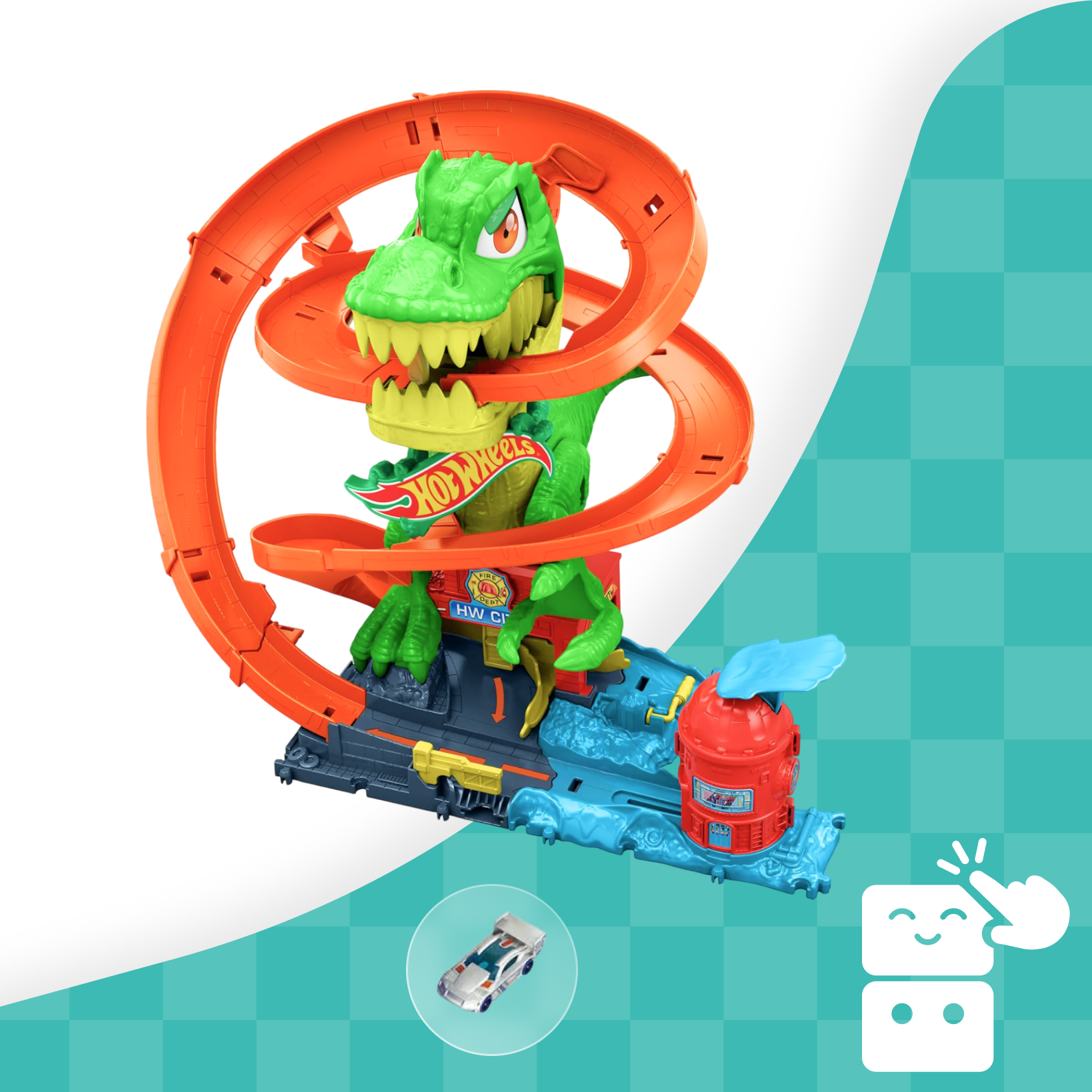 A aventura vai começar com a Trilha Hot Wheels T-Rex vs Fire Station! Uma pista cheia de ação, onde a velocidade dos carrinhos é a única chance de salvar a cidade de um ataque jurássico. Prepare-se para momentos eletrizantes, manobras insanas e muita emoção!