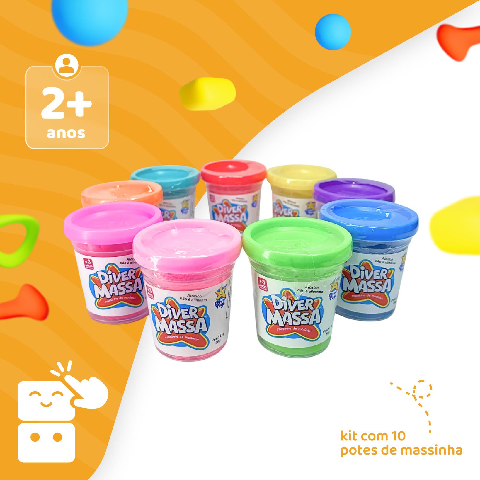 São 20 cores diferentes em potinhos de 50g, com moldes sortidos para dar forma a animais, objetos e o que mais a imaginação permitir!